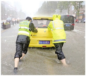 图为郑州交警支队四大队执勤民警将雨中抛锚的车辆挪开。
