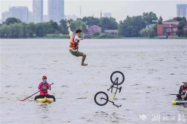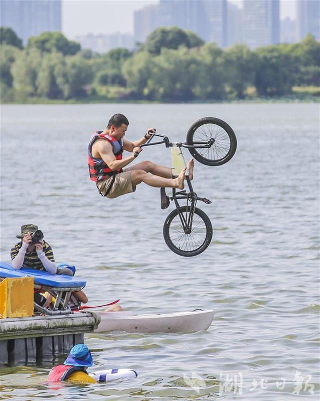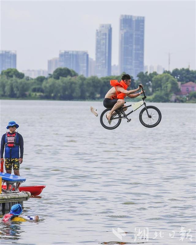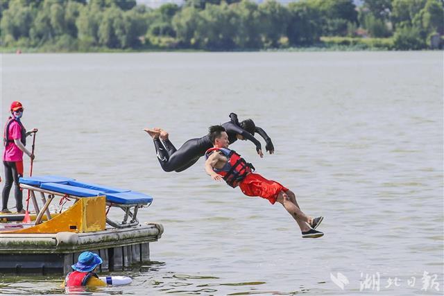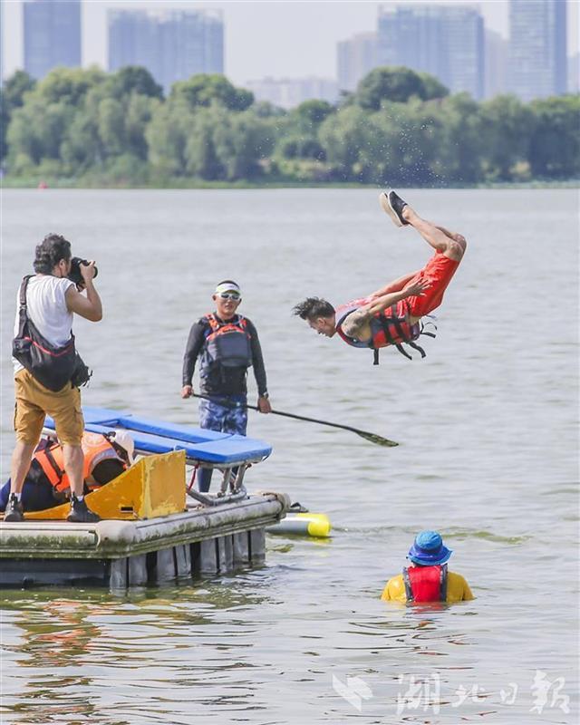 7月24日至25日,在武汉东湖磨山景区楚城水域,每年一次的武汉“跳东湖”趣味活动举行。选手们从栈道上猛力冲刺,在跳台上蹦高后轰然入湖,用扑通四溅的湖水,一把点燃江城的野性。“跳东湖”这项活动延续下来已经是第十个年头,渐渐成为武汉炎炎夏日年轻人的娱乐玩乐方式。(湖北日报全媒记者梅涛 摄)