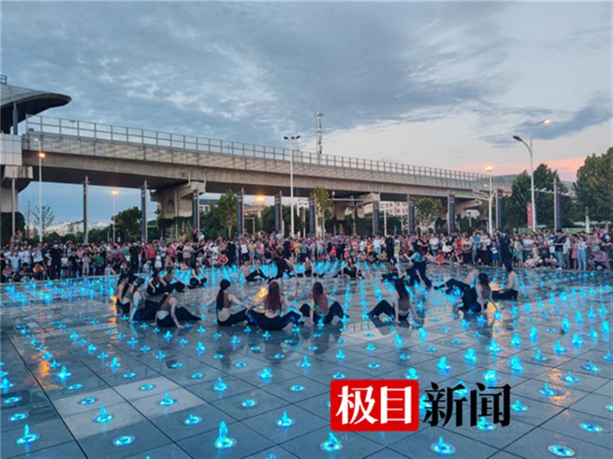 极目新闻记者在现场看到,落日余晖中,青年舞蹈家葛俊逸带领20名舞者伴着音乐喷泉的节奏在水中起舞。表演临近结束,舞者邀请围观的市民游客进入喷泉内共舞,将现场气氛推向高潮。