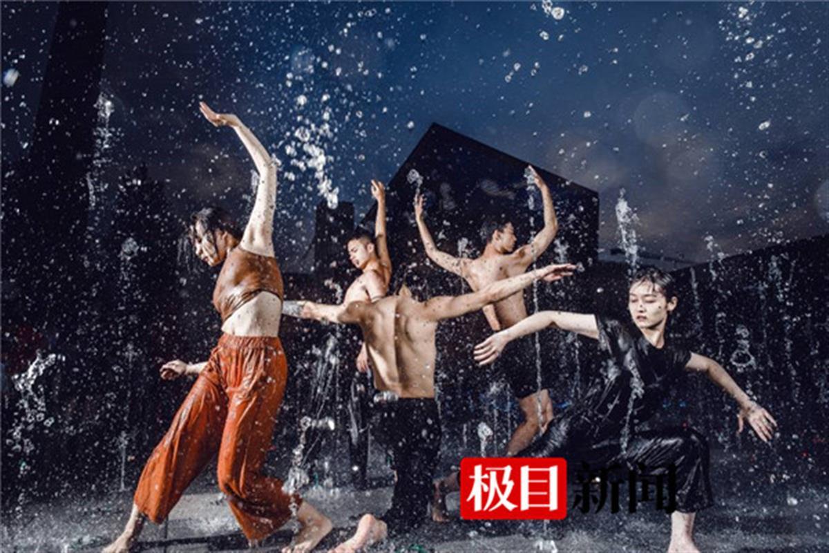 7月24日傍晚,一场名为《在水与火之间》的即兴环境舞蹈在地铁航空总部站旁的悦荟天地喷泉广场举行。