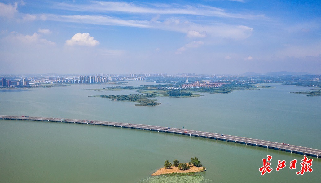俯瞰后官湖,四环线穿行湖面,水云相映。长江日报记者郭良朔 摄