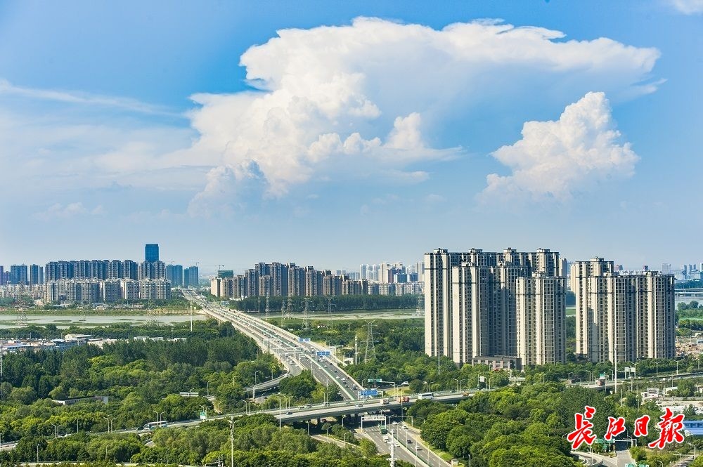 7月24日,武汉市三金潭立交往黄陂方向,天空湛蓝,白云似棉花糖。长江日报记者胡冬冬 摄