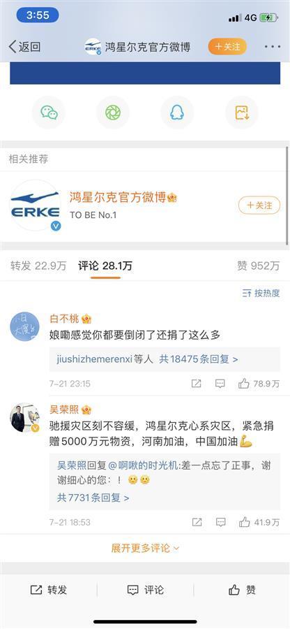 目前,鸿星尔克公布捐赠信息的微博已获952万点赞,评论区点赞数最高的一条评论为“感觉你们要倒闭了还捐了这么多”。微博话题“鸿星尔克的微博评论好心酸”一度登上微博热搜排行第一。