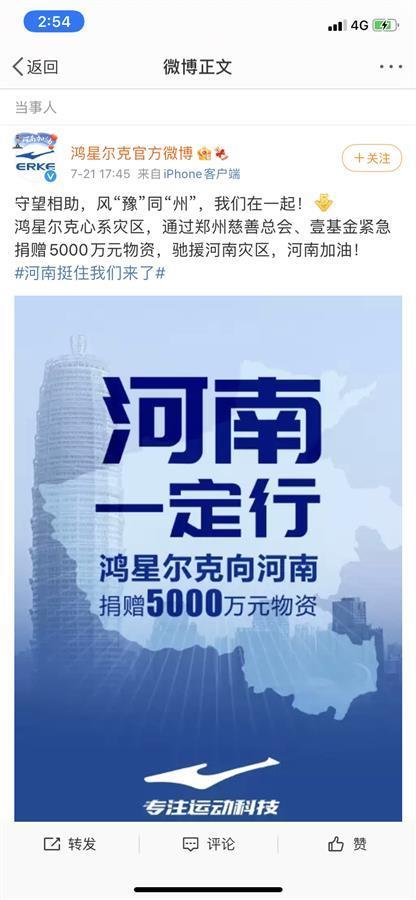 不过,也有网友质疑鸿星尔克捐赠的5000万元物资具体为何。因为公开渠道查询显示,截至7月24日22点,鸿星尔克捐赠到位的物资仅是通过壹基金捐出的20万支瓶装水。郑州慈善总会公布的捐赠企业名单中并无鸿星尔克。