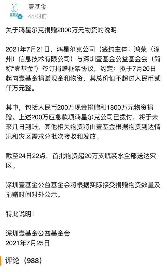 7月25日,壹基金官方微博详细说明了鸿星尔克的捐赠金额。内容显示,7月21日,鸿星尔克已与壹基金签订捐赠框架协议,拟于7月20日起向壹基金捐赠现金和物资,总价值不超过人民币2000万元整。其中,200万元应急款项鸿星尔克公司已拨付,其他物资将由壹基金根据物资到达情况和灾区需求分批次接受和发放。