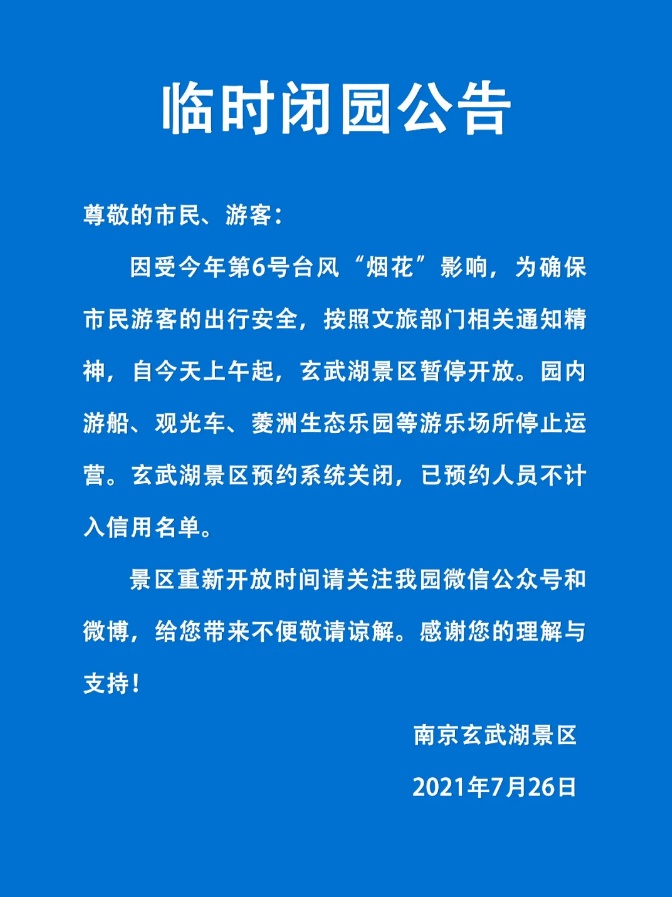 因受台风“烟花”的影响,为确保游客出行安全,接上级文旅部门通知,自2021年7月26日起,钟山风景区所属的中山陵、明孝陵、灵谷景区,音乐台、美龄宫、白马公园等景点,以及明孝陵博物馆、孙中山纪念馆、南京抗日航空烈士纪念馆等文博场馆均暂停开放。紫金山索道、区内电瓶车等设施停运。中山陵预约系统关闭,已预约游客不计入信用名单。各网络销售票按原渠道退回。