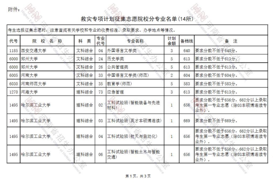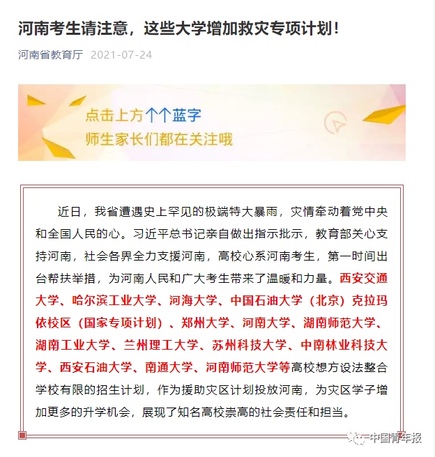 据河南省教育厅消息,西安交通大学、哈尔滨工业大学、河海大学、中国石油大学(北京)克拉玛依校区(国家专项计划)、郑州大学、河南大学、湖南师范大学、湖南工业大学、兰州理工大学、苏州科技大学、中南林业科技大学、西安石油大学、南通大学、河南师范大学等高校想方设法整合学校有限的招生计划,作为援助灾区计划投放河南,为灾区学子增加更多的升学机会,展现了知名高校崇高的社会责任和担当。