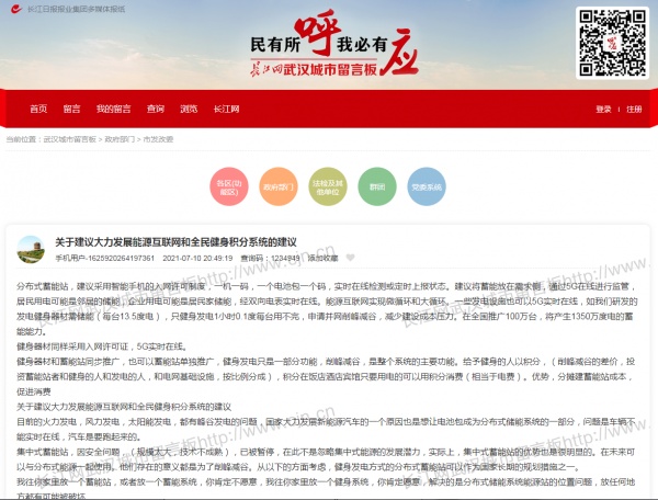 他告诉记者,自己上网查询到武汉有分布式能源系统方面的规划,浏览武汉市人民政府网站时,看到了“武汉城市留言板”留言端口,便很认真地在武汉城市留言板上写下了千余字留言,分享自己的奇思妙想。