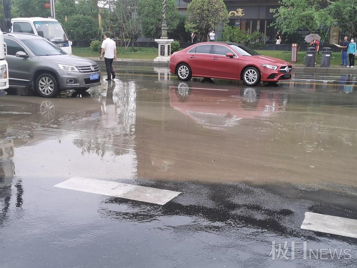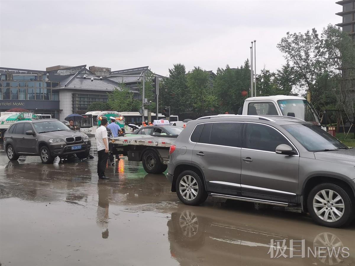 26日下午4时左右,极目新闻记者来到大唐芙蓉园西门。此时,路面的积水基本已经褪去,四五台洒水车及大量的环卫人员正在对路面污渍进行清理和清扫。交警正在现场指挥交通,趴窝的两台小车被拖车拖走。