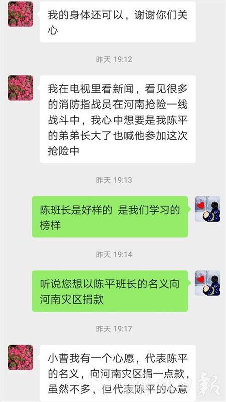 “这段时间在新闻上,我看到很多消防员都去增援河南了,大家辛苦了!作为陈平的妈妈,同样也算咱们宜昌消防救援队伍的一员,我也想为灾区人民尽点力。”7月24日上午,宜昌市消防救援支队政治部副主任文涛,接到了消防英雄陈平烈士的母亲张秀华从四川绵阳打来的电话。