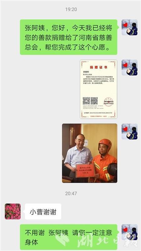 “张妈妈还希望通过我向大家转达,让大家在防汛救灾的同时,一定要注意安全,保护好自己”,曹世龙介绍道,“大家知道张妈妈的举动后,很受感动,也很受鼓舞!”