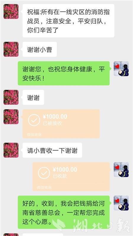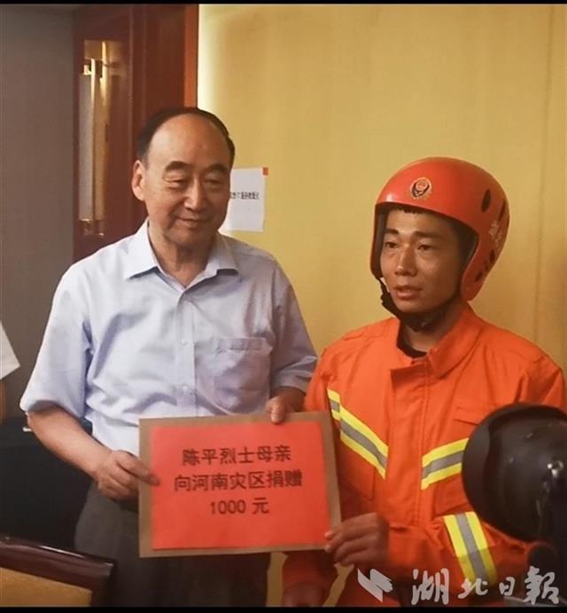 从四川绵阳到湖北宜昌,再到河南郑州,虽然相隔千里,却承载着一个年近六旬的英雄母亲对儿子生前单位、战友们和灾区人民的牵挂。因此,她特地委托宜昌市消防救援支队援豫指战员向灾区人民奉献自己的一份爱心。7月25日,身在抗洪救灾一线的宜昌市消防救援支队五峰大队武汉大道消防站副站长曹世龙,将张秀华以儿子陈平的名义捐赠的1000元善款送到了河南省慈善总会。