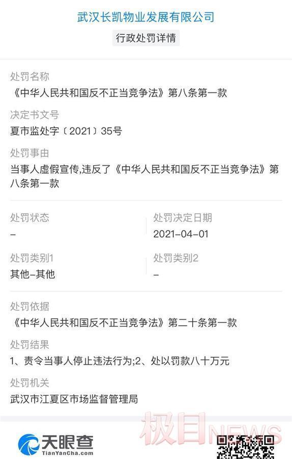 记者通过国家企业信用信息公示系统和查询发现,武汉长凯物业发展有限公司的大股东为南京雅居乐房地产开发有限公司,认缴金额占比99.7%。在抽查检查结果信息一栏中,2018年11月23日,武汉市住房保障和房屋管理局抽查结果显示,武汉长凯物业发展有限公司“擅自销售已抵押或被查封等被限制的商品房,雅居乐国际花园擅自销售被查封的商品房”两条记录。天眼查则显示,该公司自身风险1136条,有1条行政处罚信息,由江夏区市场监督管理局开出,处罚事由为:当事人虚假宣传,违反了不正当竞争法,责令当事人停止违法行为,处以罚款80万元。