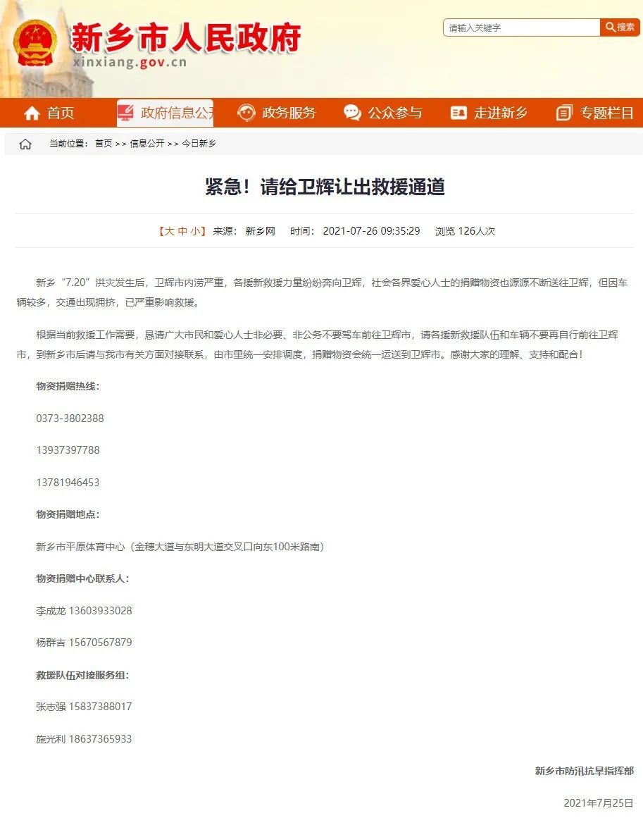 “恳请广大市民和爱心人士非必要、非公务不要驾车前往卫辉市,请给卫辉让出救援通道。”