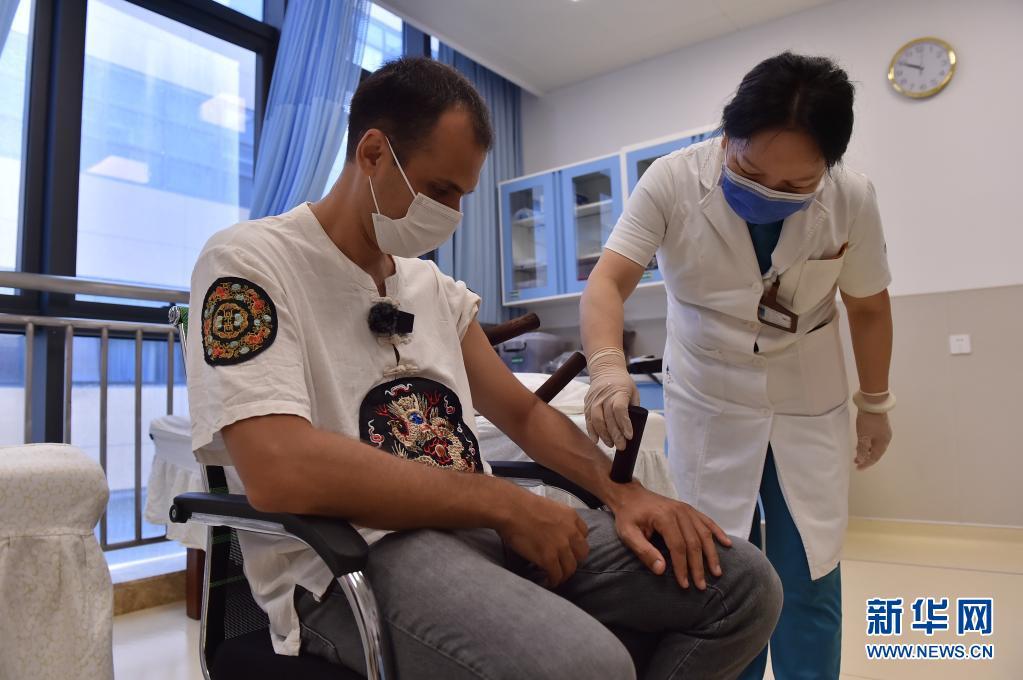 7月14日,莫小龙(左)在广西国际壮医医院参观学习时体验壮医药物竹罐疗法。