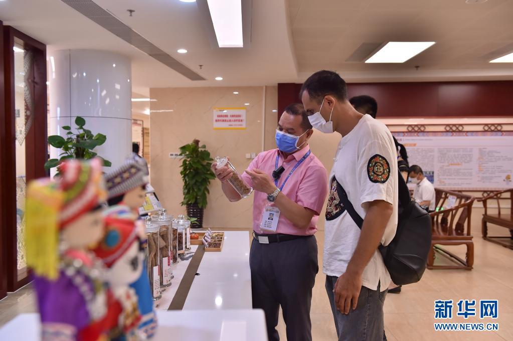 7月14日,莫小龙(右)在广西国际壮医医院参观学习时观察中药材。