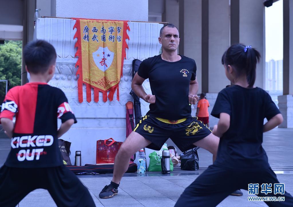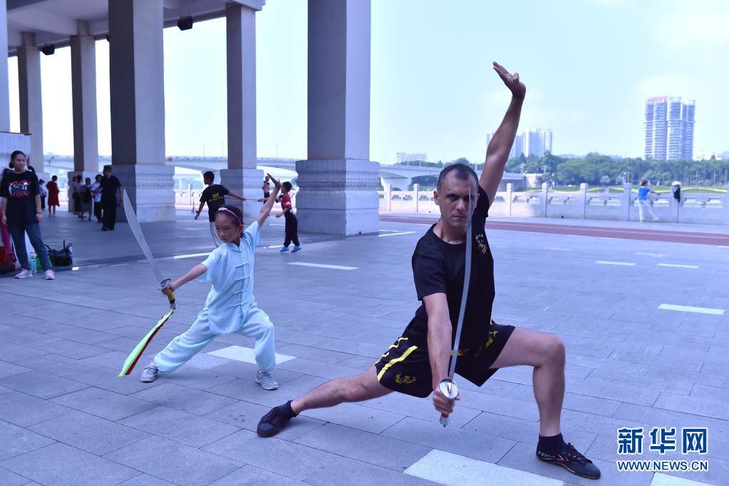 7月25日,在南宁市民生广场,莫小龙(中)演示武术动作。