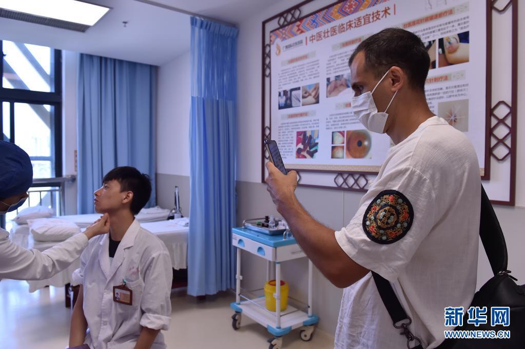 7月14日,莫小龙(右)在广西国际壮医医院参观学习时,用手机拍摄壮医药线点灸疗法。