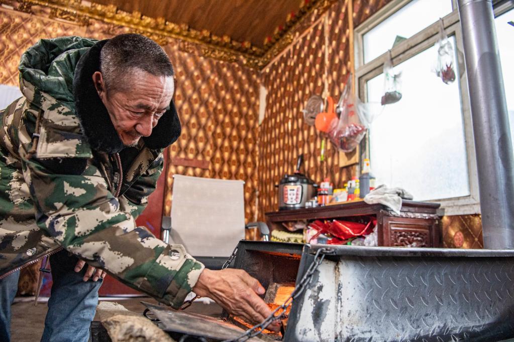 索朗次仁正在给炉子生火(4月1日摄)。新华社记者 孙非 摄