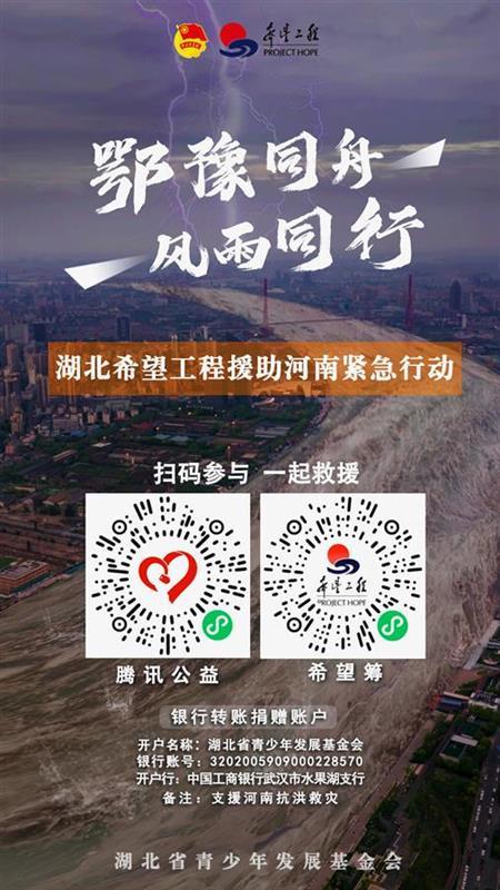 团省委、省青基会于7月21日第一时间启动“鄂豫同舟 风雨同行——湖北希望工程援助河南紧急行动”,面向社会广泛发起募捐,驰援河南受灾地区。