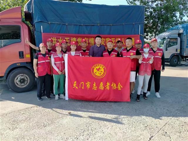 7月25日,天门团市委、天门市志愿者协会发动爱心志愿者、社会组织、老庙黄金等爱心组织和企业紧急筹备的矿泉水、方便面、酒精、消毒液等一批急需生活物资连夜紧急驰援新乡。