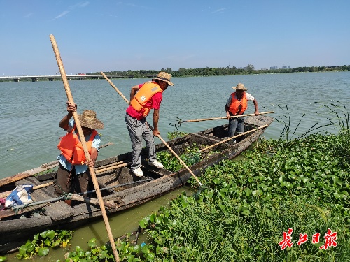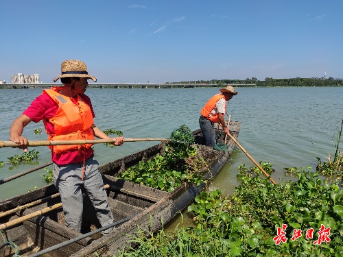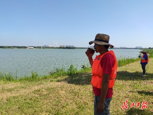 长江日报7月27日讯 天上有个太阳,水里也有个太阳。25日是周日,上午艳阳高照,后官湖湿地公园南湾湖大桥附近水域的气温达到35摄氏度。后官湖湿地公园水域环境养护员、58岁的黄清平正坐在岸边树荫下,等待清理船的到来。