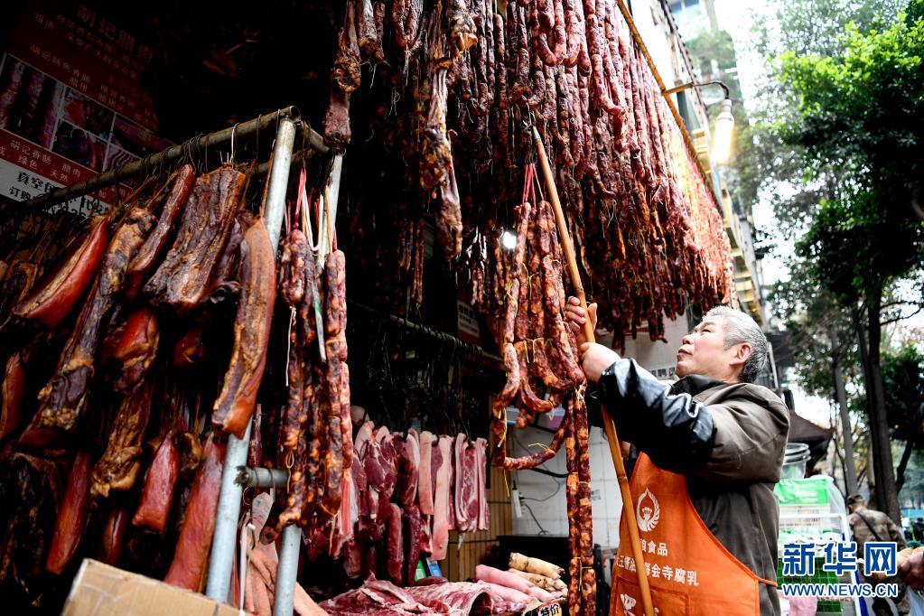 在四川省成都市新开寺街,商贩取下客人预约购买的香肠(2019年12月31日摄)。新华社记者 王曦 摄