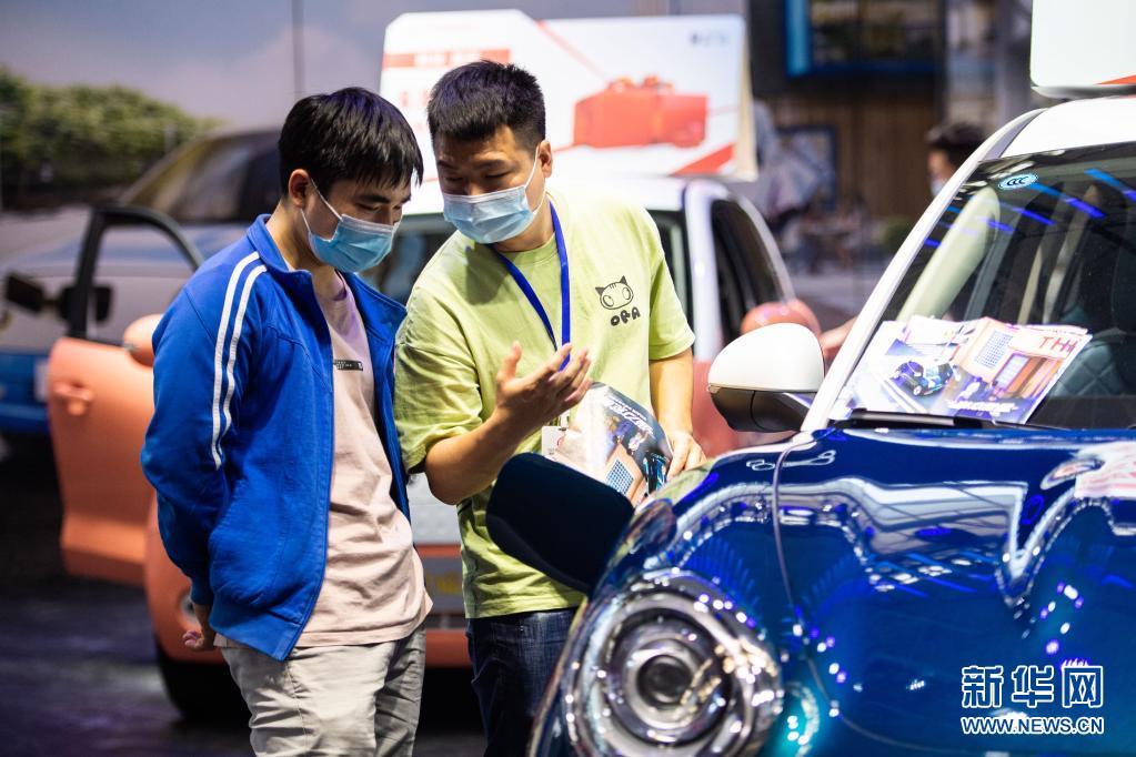 在湖南省长沙市举行的2021湖南汽车展览会暨长沙市汽车消费节上,工作人员(右)向参观者介绍展车(5月1日摄)。新华社记者 陈思汗 摄