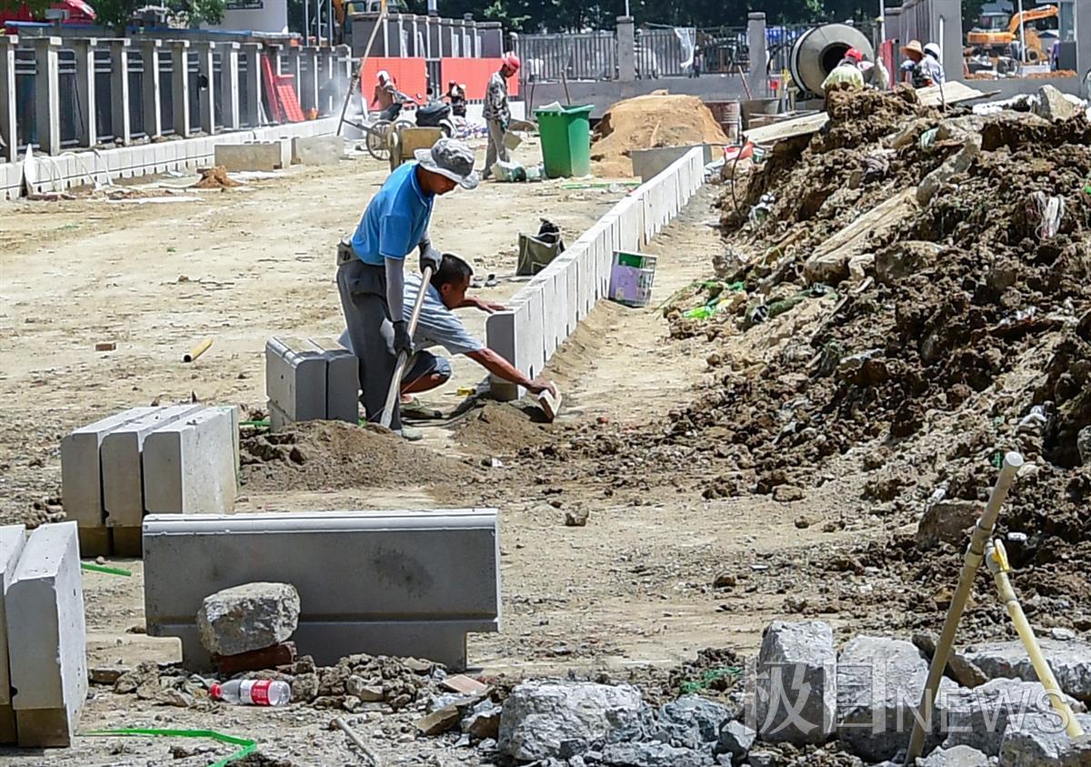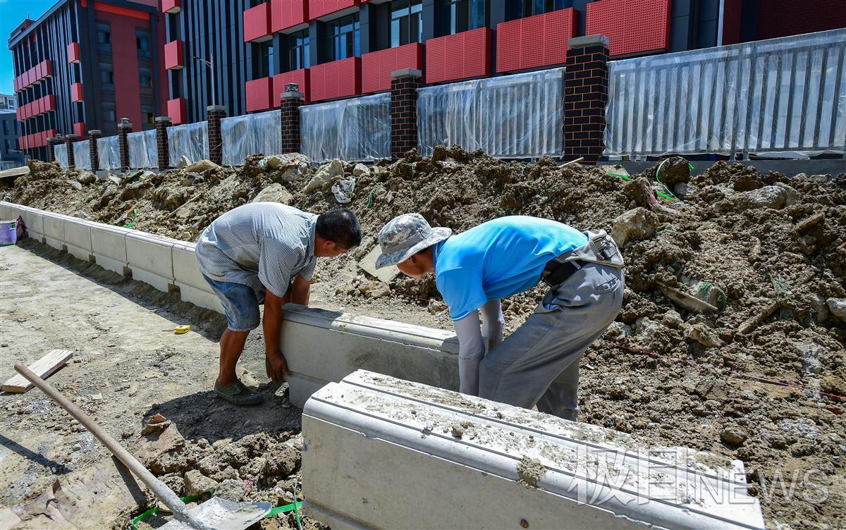 7月27日中午,在武汉市东西湖海城六路施工工地,十多名工人正在加紧赶修道路的配套设施。在道路的另一侧,两位工人师傅正在搬运修筑道路的路缘石,只见一名师傅将水泥铺平,然后两人喊着口号“1、2、3”,一块200斤重的路缘石就平整地固定在目标位置。