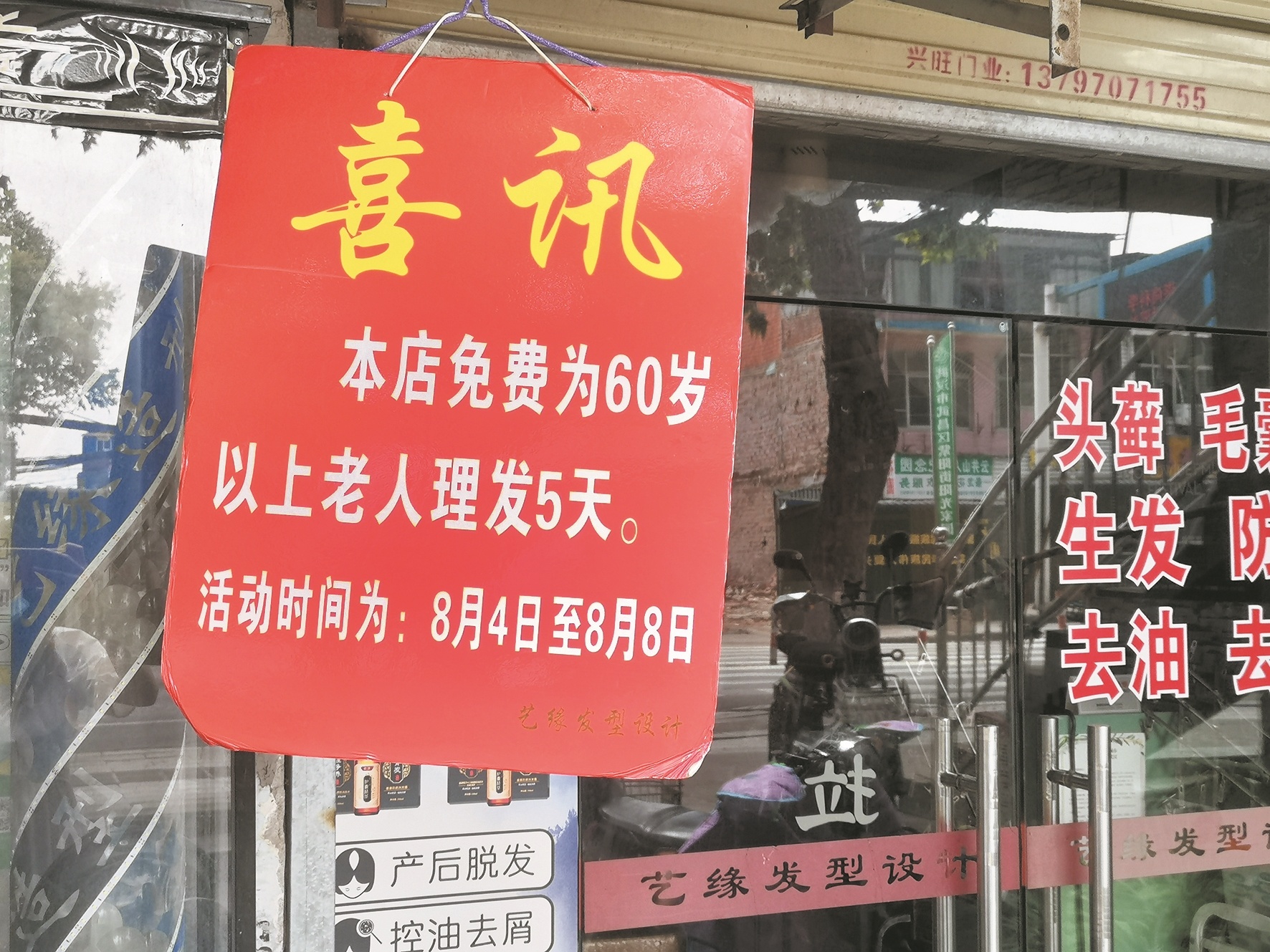 “这家理发店主好暖心,要给60岁以上老人免费理发。”近日,热心读者郑军致电极目新闻记者,称路过武汉武泰闸蔬菜大市场时,看到路边有家理发店挂着一个牌子,上面写有“本店为60岁以上老人免费理发5天,活动时间8月4至8月8日”。7月27日,极目新闻记者探访来到这家叫做艺缘的理发店,在店外看到了那张显眼的红底白字的通告。