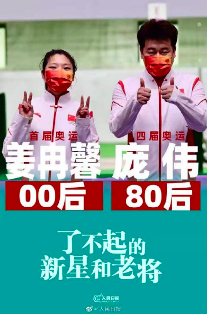 在27日东京奥运会10米气手枪混合团体赛中,00后的姜冉馨和80后的庞伟为中国代表团摘得第七金。网友:老将和新星的完美配合,为你们喝彩!
