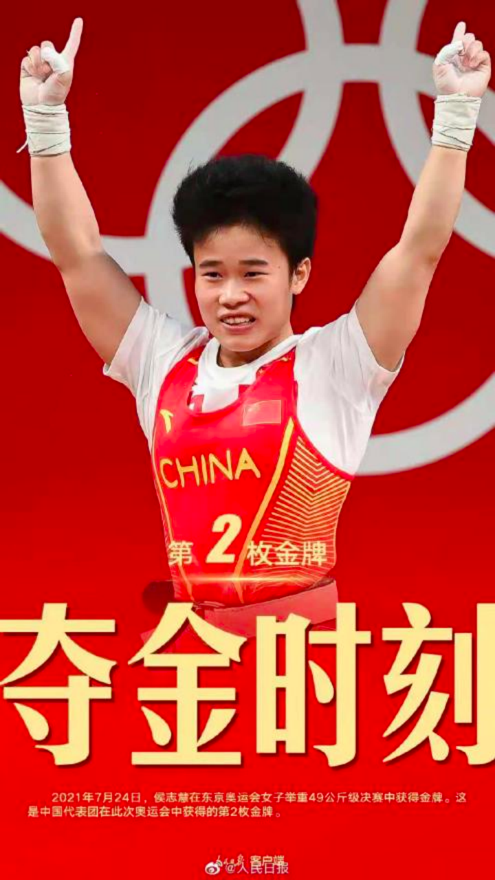 7月24日,在东京奥运会女子举重49公斤级决赛中,中国选手侯志慧为中国队拿下第二枚金牌,创造了举重奥运会纪录,义勇军进行曲再次响彻东京奥运会。