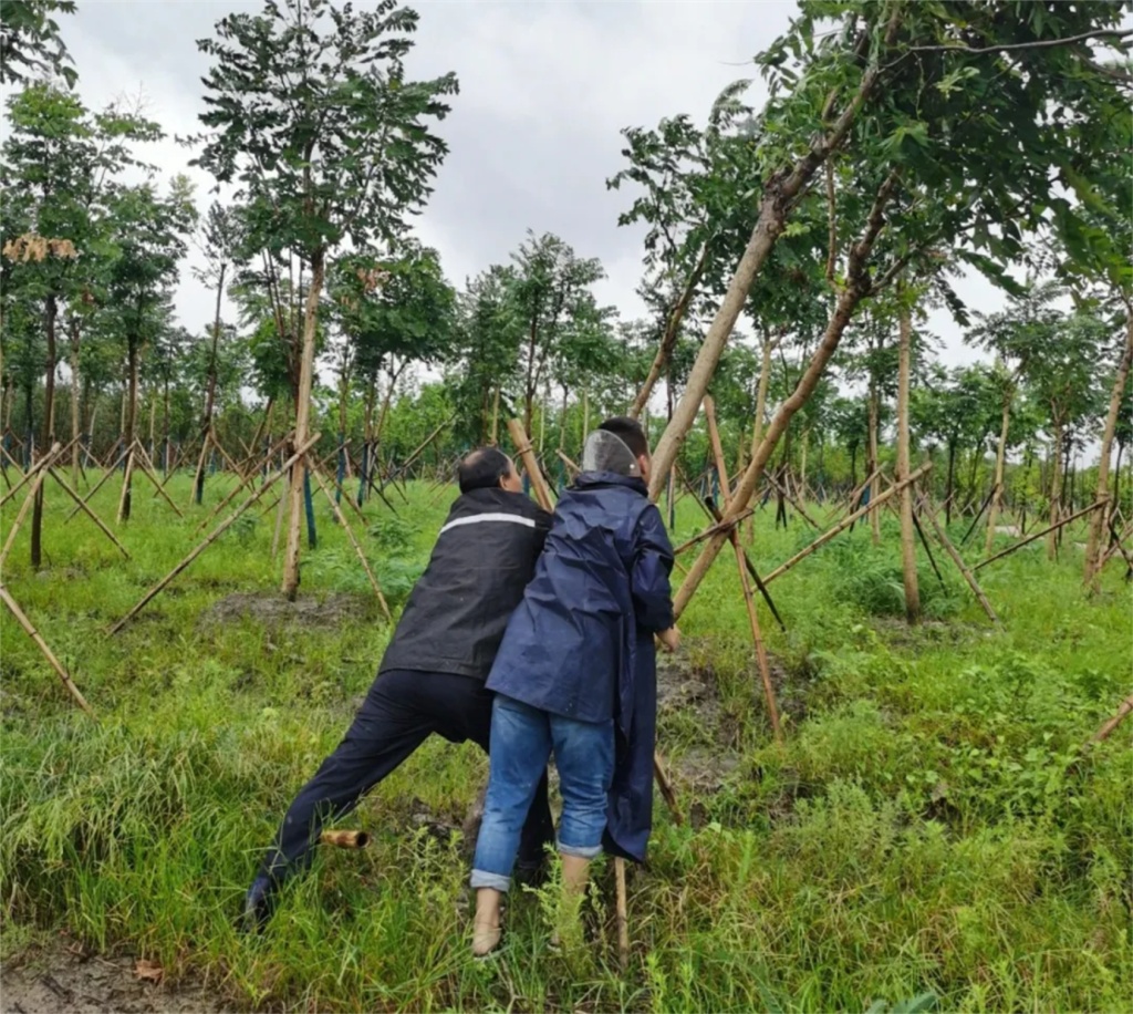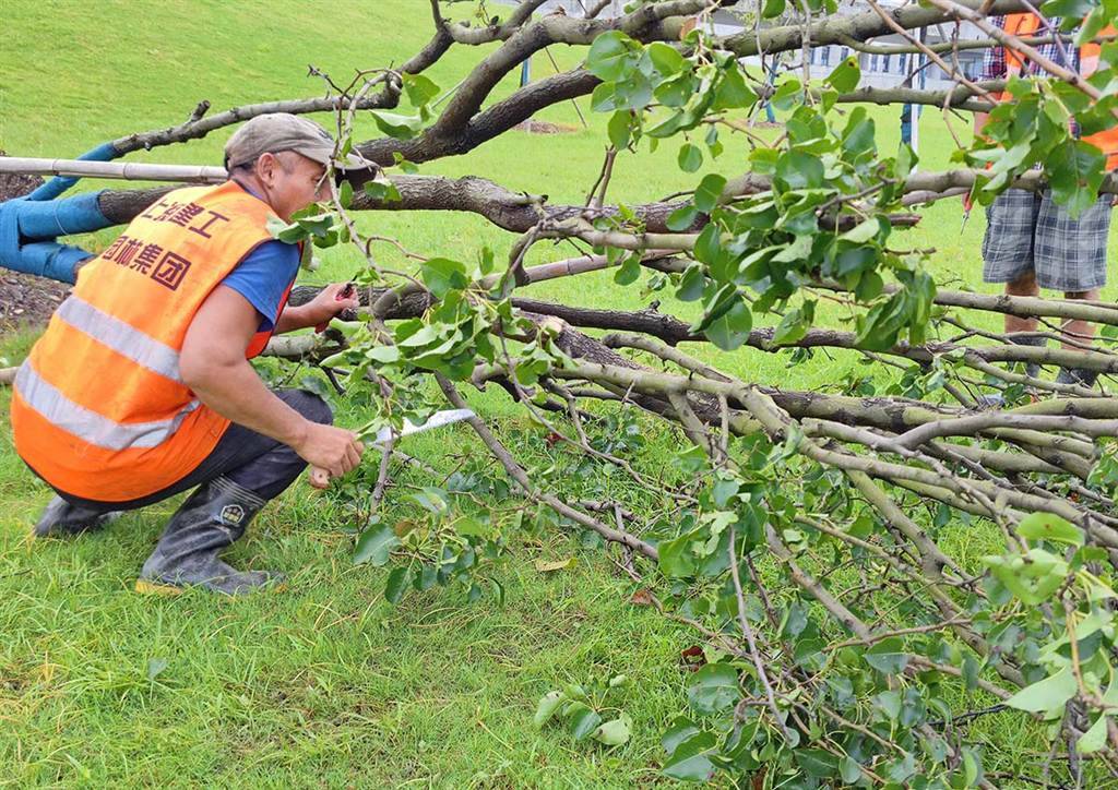 在倒伏树木处理过程中,工作人员首先对扶正树木进行树冠和受损根系的修剪,以减少后期水份的蒸腾,防止根系的腐烂;接着,在倒伏树木扶正后及时做好支撑,防止树干再次倾倒;后期还将根据植物恢复状况,及时使用生根剂、抗蒸腾剂等措施,并做好病虫害防治工作,确保植物成活率。