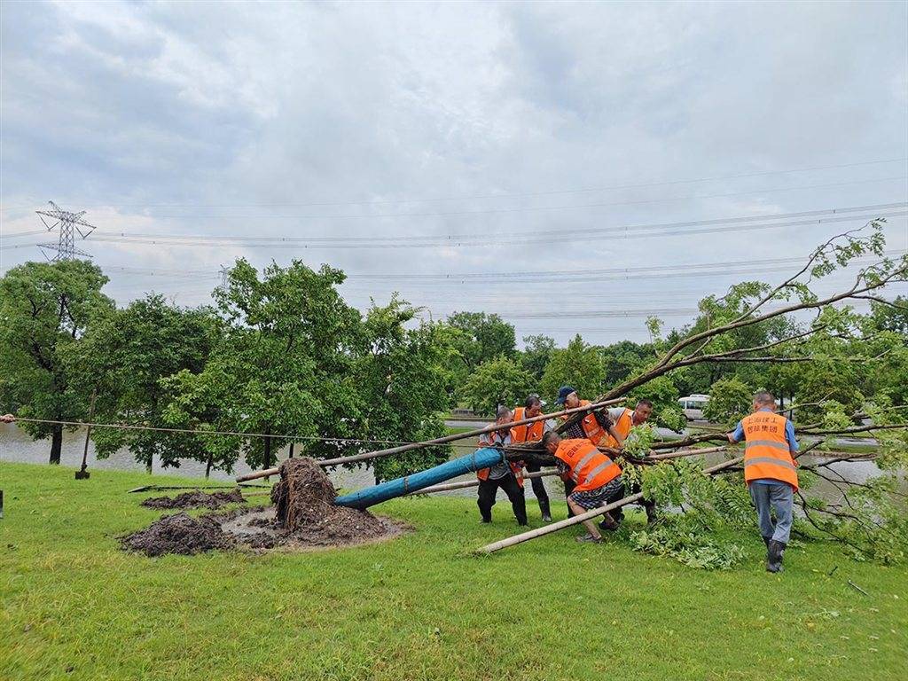 在辰山植物园,灾后修复及林木抢救工作正在有序推进。截止7月27日15:30,全园倒伏树木243株,大枝折断树木78株,倾斜植株68株,竹林、灌木倒伏多达1500平方。园艺景观部派出专业技术人员和一线工人针对室外区域及温室区域、苗木不同品种、具体受灾受损情况,进行实时统计并逐一制定修复抢救方案,治愈植物“创伤”,尽全力将损失降到最低。