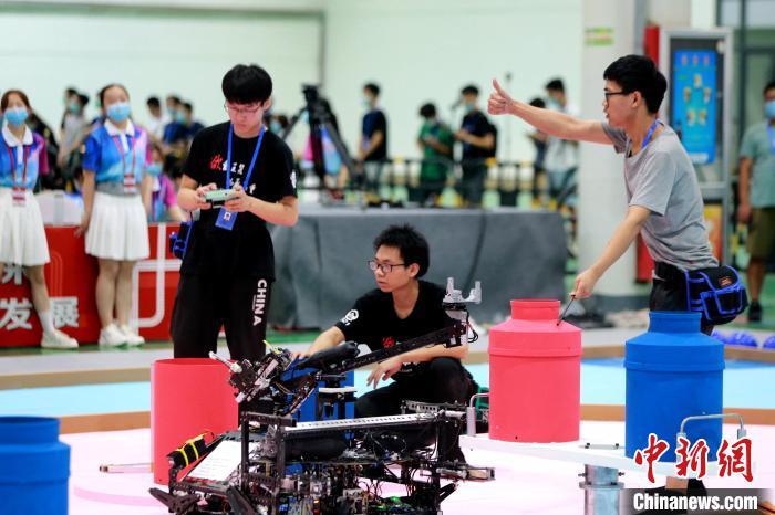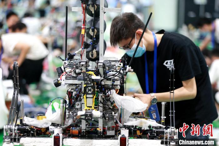 参赛选手对机器人做最后的调试。 梁犇 摄