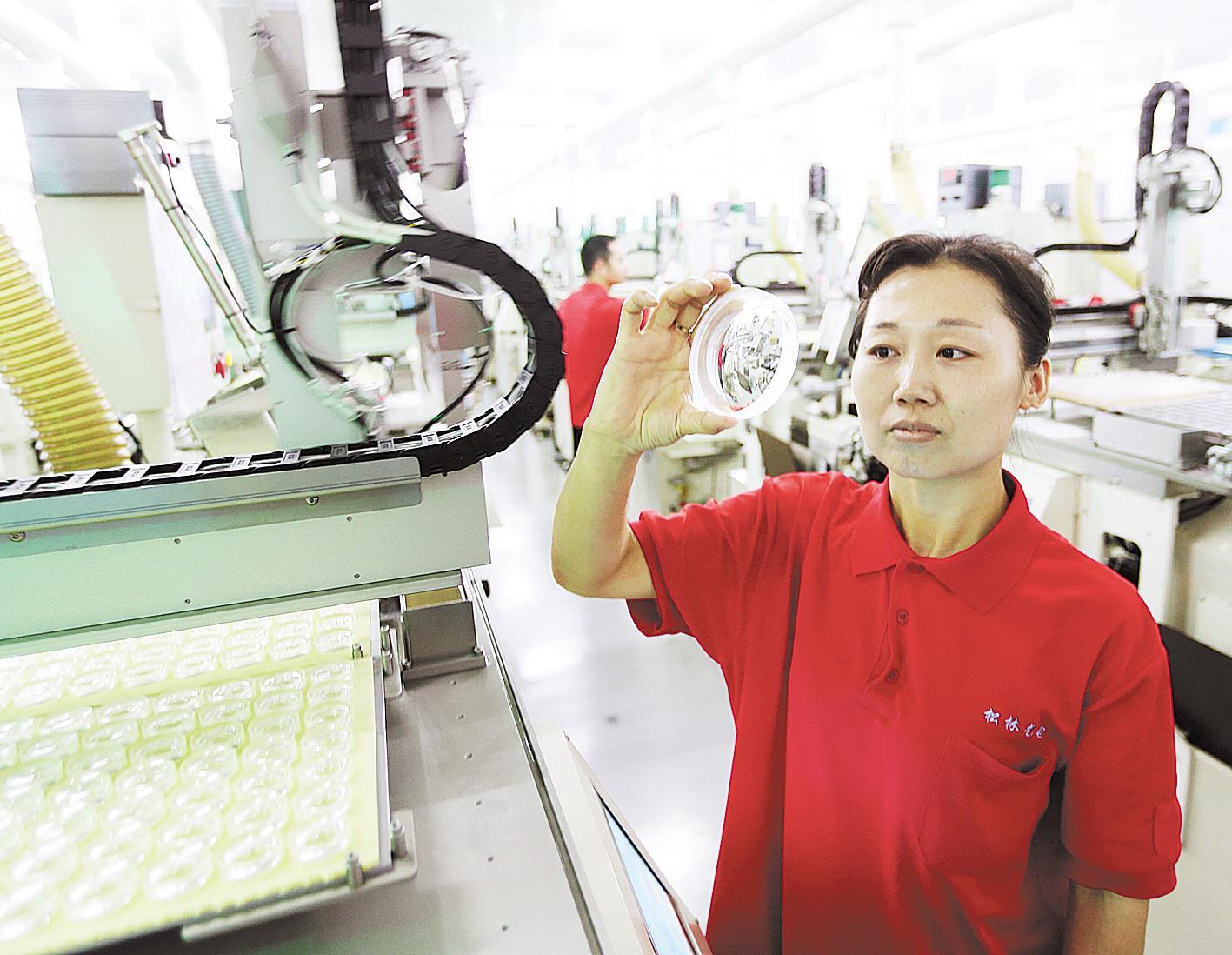 7月23日,位于孝感市孝南经济开发区的松林光电科技(湖北)有限公司员工在无尘恒温自动化车间检验光学产品。该公司是致力制造棱镜、透镜及异型光学精密组件的高新技术企业,产品广泛运用于激光电视、指纹认证、3D打印、热成像等领域,上半年营业收入同比增长20%。