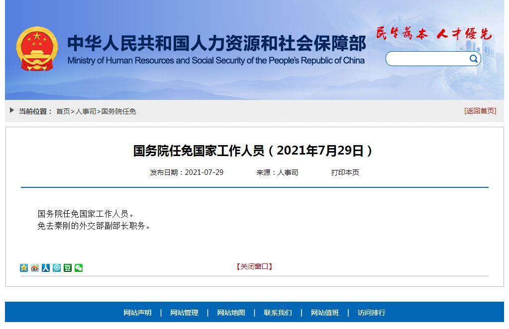 中新网7月29日电 据人社部网站消息,国务院任免国家工作人员,免去秦刚的外交部副部长职务。