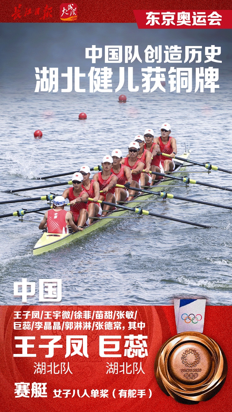长江日报7月29日讯 在刚刚进行的东京奥运会赛艇女子八人单桨有舵手决赛中,中国队夺得了铜牌。