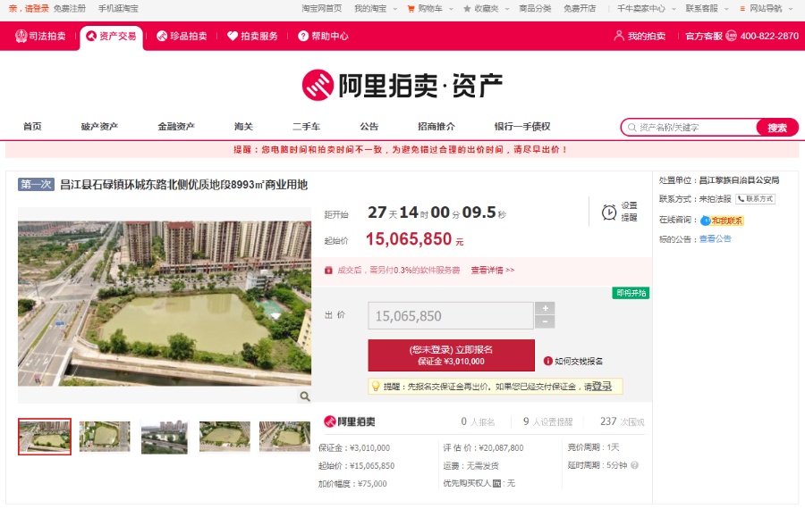 打开淘宝网网址,进入阿里拍卖平台,首先映入眼帘的即是以轮播图片形式展现的昌江公安拍卖专场入口。专场内设有房产经纪产、股权、工程车、机动车、土地、其他等资产类别。 8月11日至8月27日,该批涉黑资产将陆续正式开拍,这其中包含了搅拌站、房地产公司、驾校、网吧、银行股权、 商业用地、住宅、商铺、停车位、汽车、工程车、摩托车、 家具家纺、办公用品、3C 数码、娱乐场所设备器材等资产, 种类可谓琳琅满目。