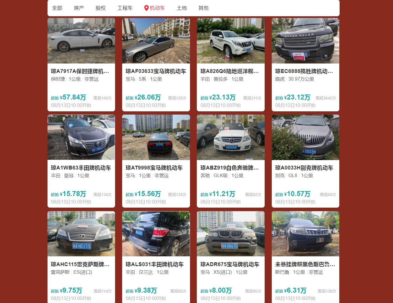 另外,第一次上拍的标的物也不乏优质资产,其中就有位于昌江县石碌镇环城东路繁华地段一处面积达8993m²的商业用地,评估价2008.78万元,起拍价仅需1506.58万元,相当于单价111.68万元/亩,涨值空间巨大;7处昌江县城 的住宅或商铺(包括原昌源茶庄),评估总价1124.73万元;18辆小型汽车,包括奔驰、宝马、保时捷-帕拉梅拉、奥迪、 雷克萨斯、丰田(霸道、皇冠、汉兰达)等优质车型,评估 总价291.63万元,值得一提的是,这批车辆依然是带车牌指标拍卖,只要成功竞拍即可直接办理上牌。