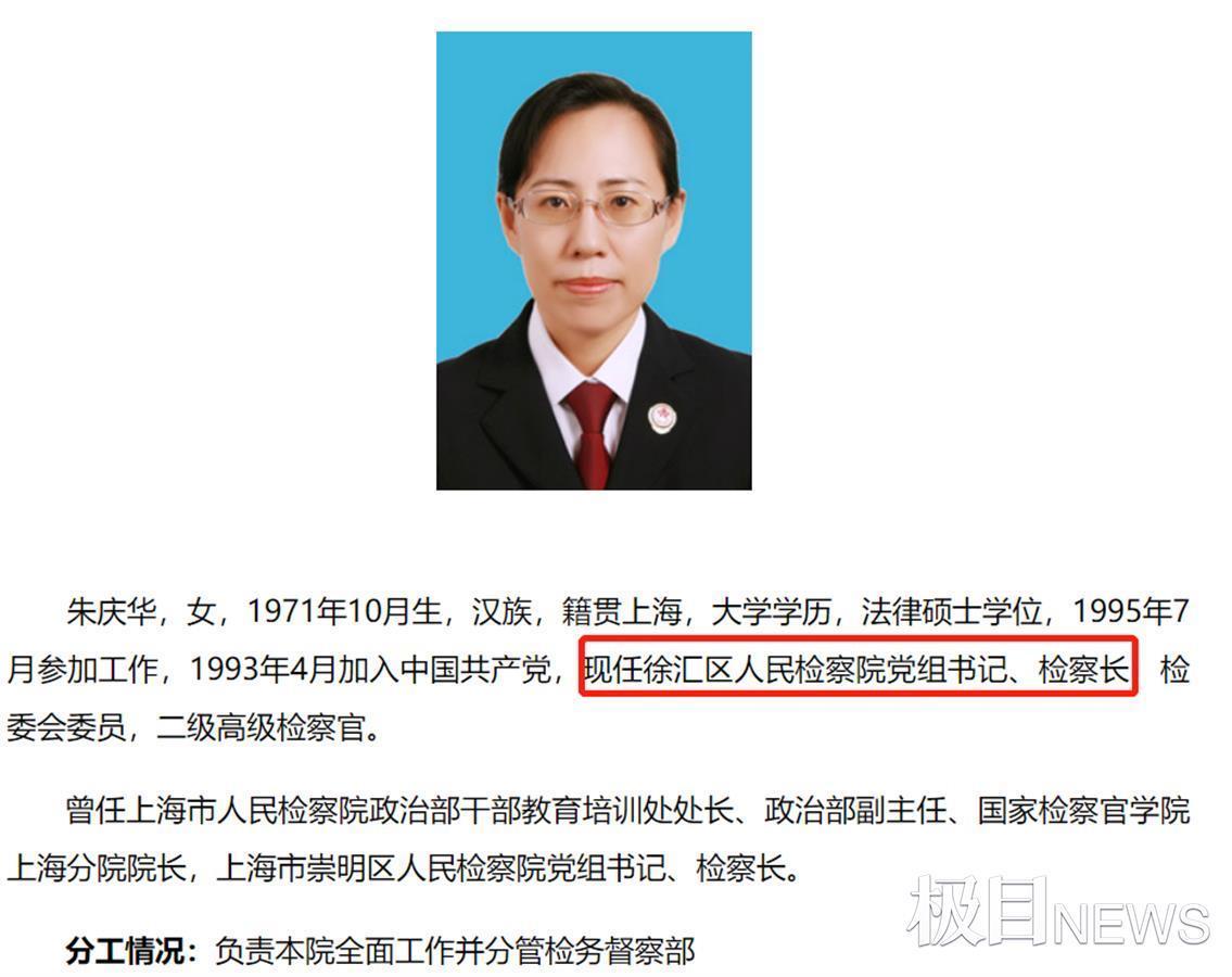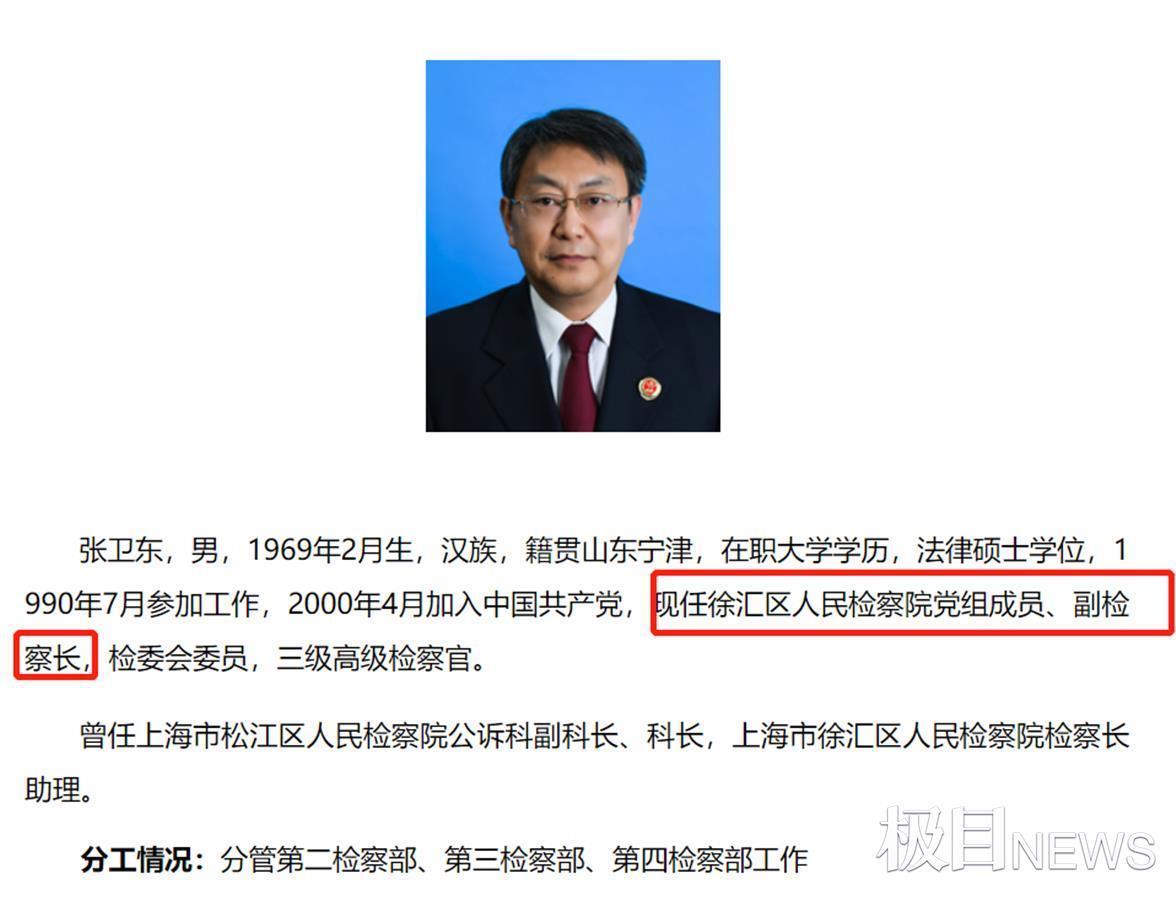 随后,极目新闻记者查阅该院官网看到,徐汇区人民检察院现任党组书记、检察长为朱庆华(女),该检察院领导班子成员为两男四女,两位男性当中,带检察长(副)头衔的只有张卫东一人。