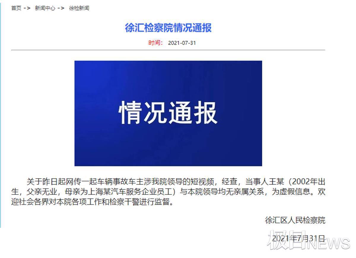 31日上午,徐汇检察院发布情况通报,称:“关于昨日起网传一起车辆事故车主涉我院领导的短视频,经查,当事人王某(2002年出生,父亲无业,母亲为上海某汽车服务企业员工)与本院领导均无亲属关系,为虚假信息。欢迎社会各界对本院各项工作和检察干警进行监督。”