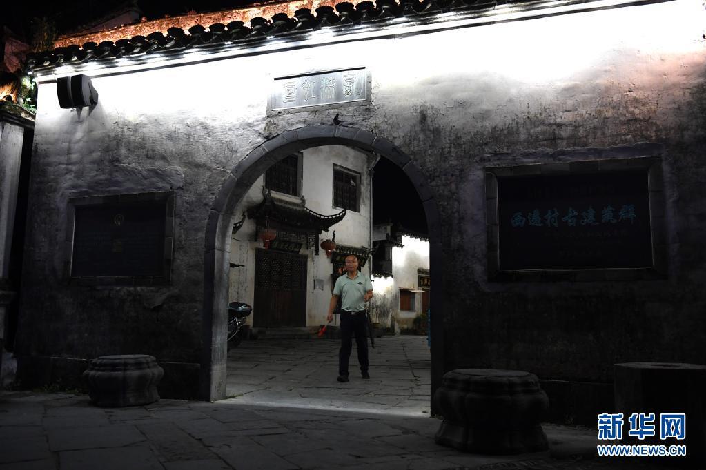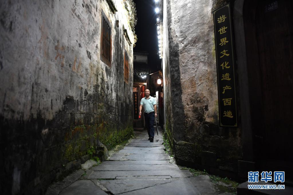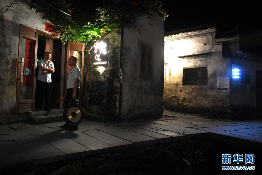 7月29日深夜,卢磊在西递村的街巷里打更。新华社记者 刘军喜 摄