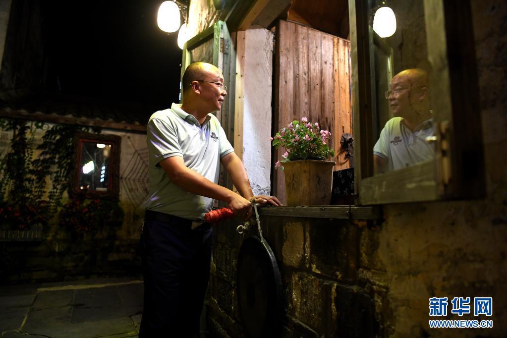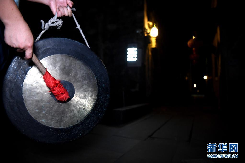 铛!深夜,一声低沉的锣响荡开在寂静的千年古村安徽西递。“80后”打更人卢磊扬起手中的木槌,走过纵横交错的深巷,将锣声送往村里的每一个角落。