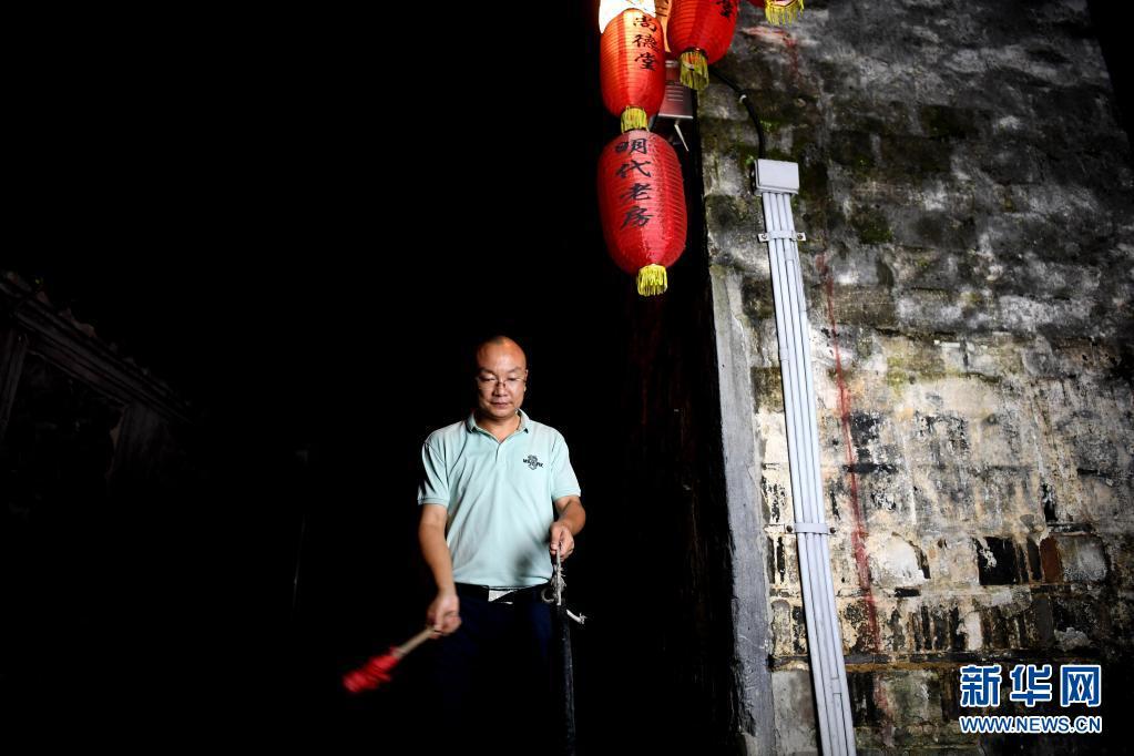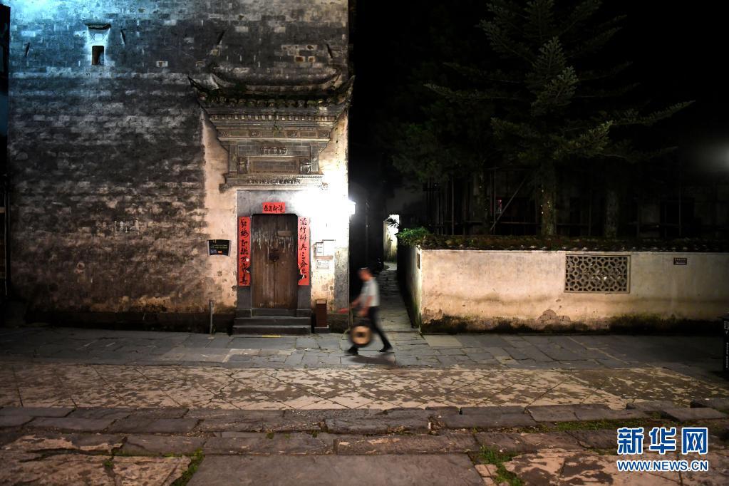 7月29日深夜,卢磊在西递村的街巷里打更。新华社记者 韩旭 摄