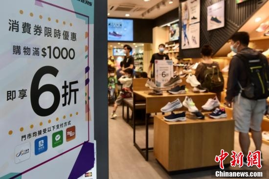 8月1日,香港特区政府向市民发放第一期2千港元电子消费券,位于尖沙咀一商场、零售商户推出不同的优惠,吸引大量市民入內消费。图为一商户平台推出优惠吸引市民消费。