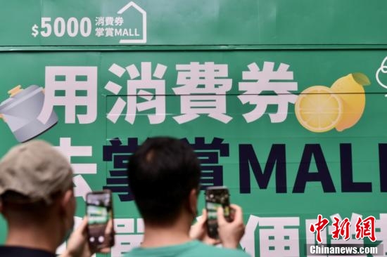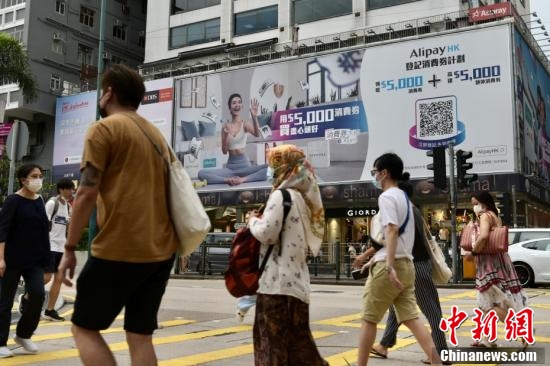8月1日,香港特区政府向市民发放第一期2千港元电子消费券,位于尖沙咀一商场、零售商户推出不同的优惠,吸引大量市民入內消费。图为尖沙咀户外广告提醒市民登记领取消费券。