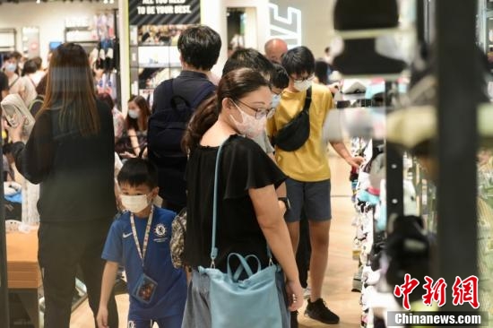 8月1日,香港特区政府向市民发放第一期2千港元电子消费券,位于尖沙咀一商场、零售商户推出不同的优惠,吸引大量市民入內消费。图为市民于商店内购物。
