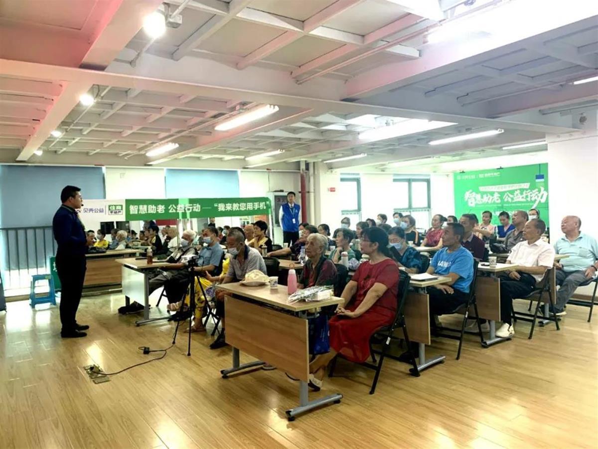 准备就绪,脸上挂着笑容,戴着麦克风,今天的讲师蔡舜登台讲课。亲切的问候、熟悉的讲解,不时穿插提问,情景互动式教学,面对面建群抢红包……台下老人目不转睛,认真听讲,积极回应,气氛热烈。
