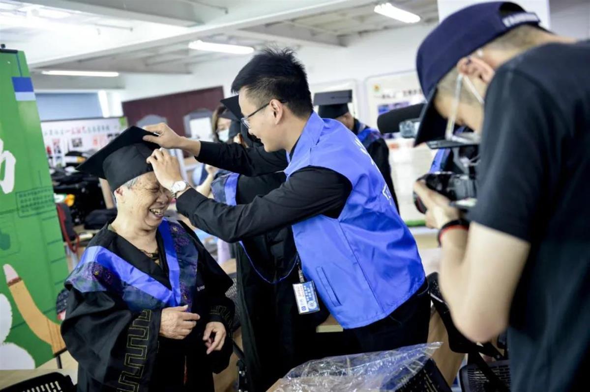 一个小时后,课程圆满结束。听说要穿上“学士服”,63岁的余会明期待不已。“以前只看到我女儿穿过,这辈子我还是第一次穿!”话语中流露出她的兴奋和喜悦。但是衣服穿在了身上,帽子怎么戴、衣领怎么放,余会明和其他老人没弄明白,翻来覆去地研究,最后在志愿者的帮助下顺利穿戴整齐。